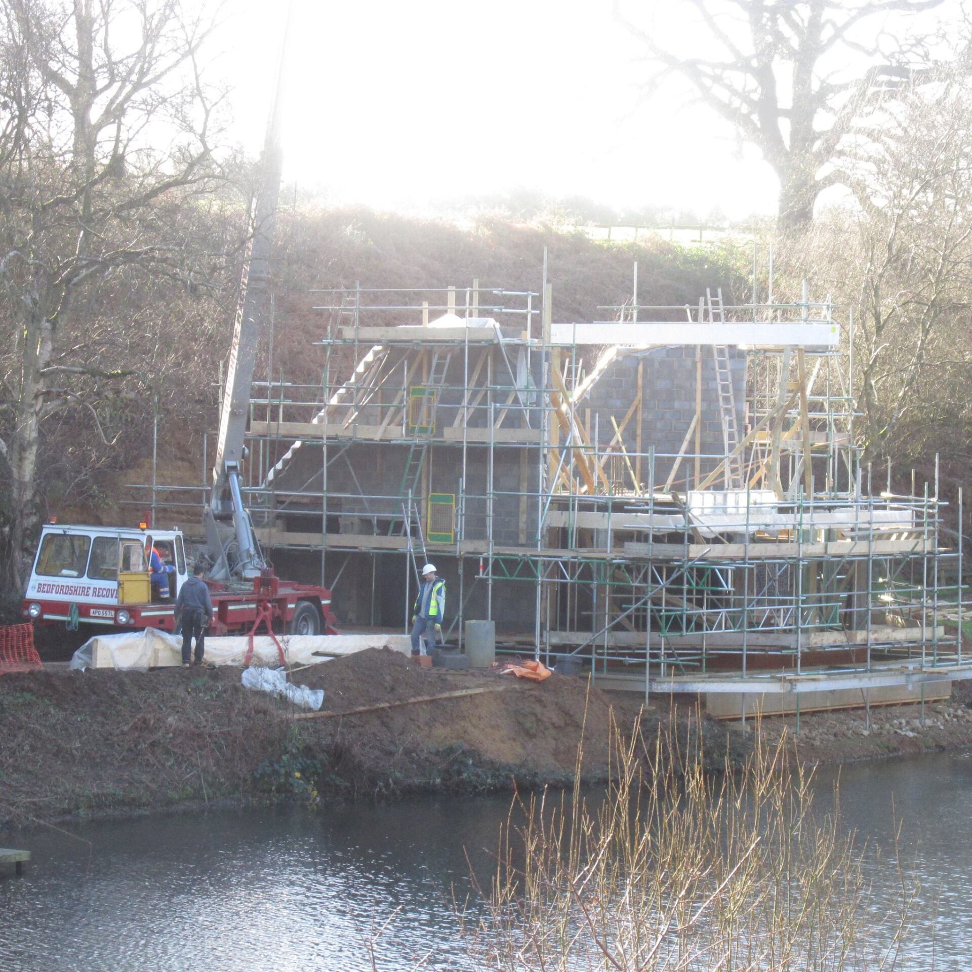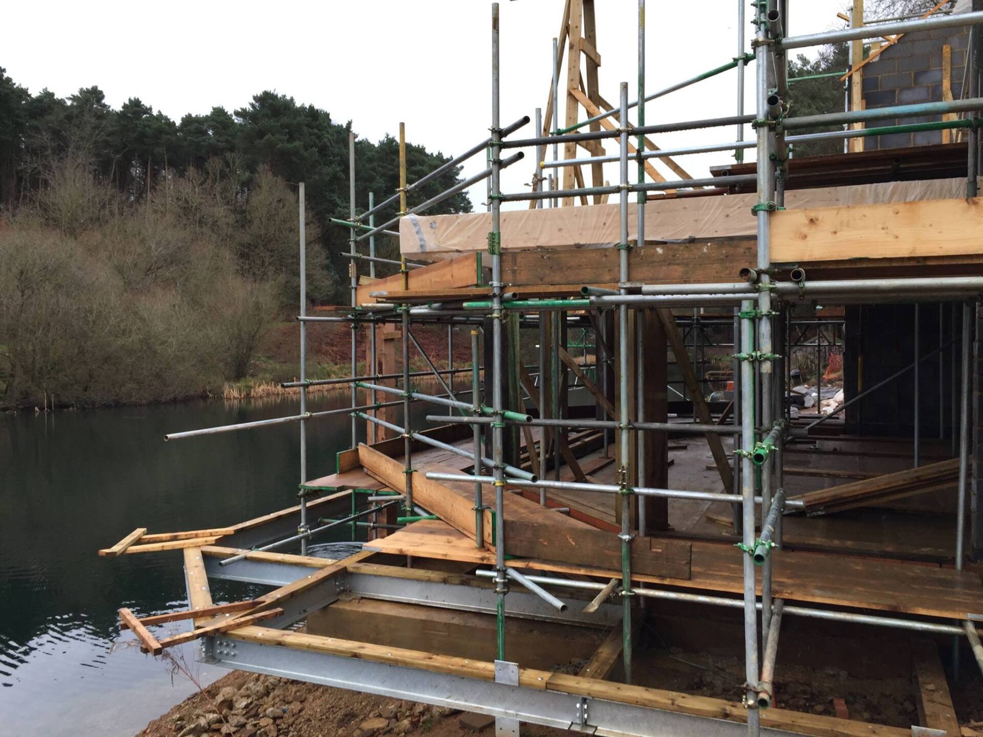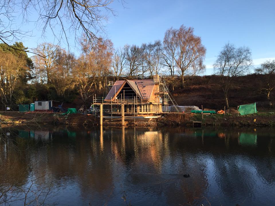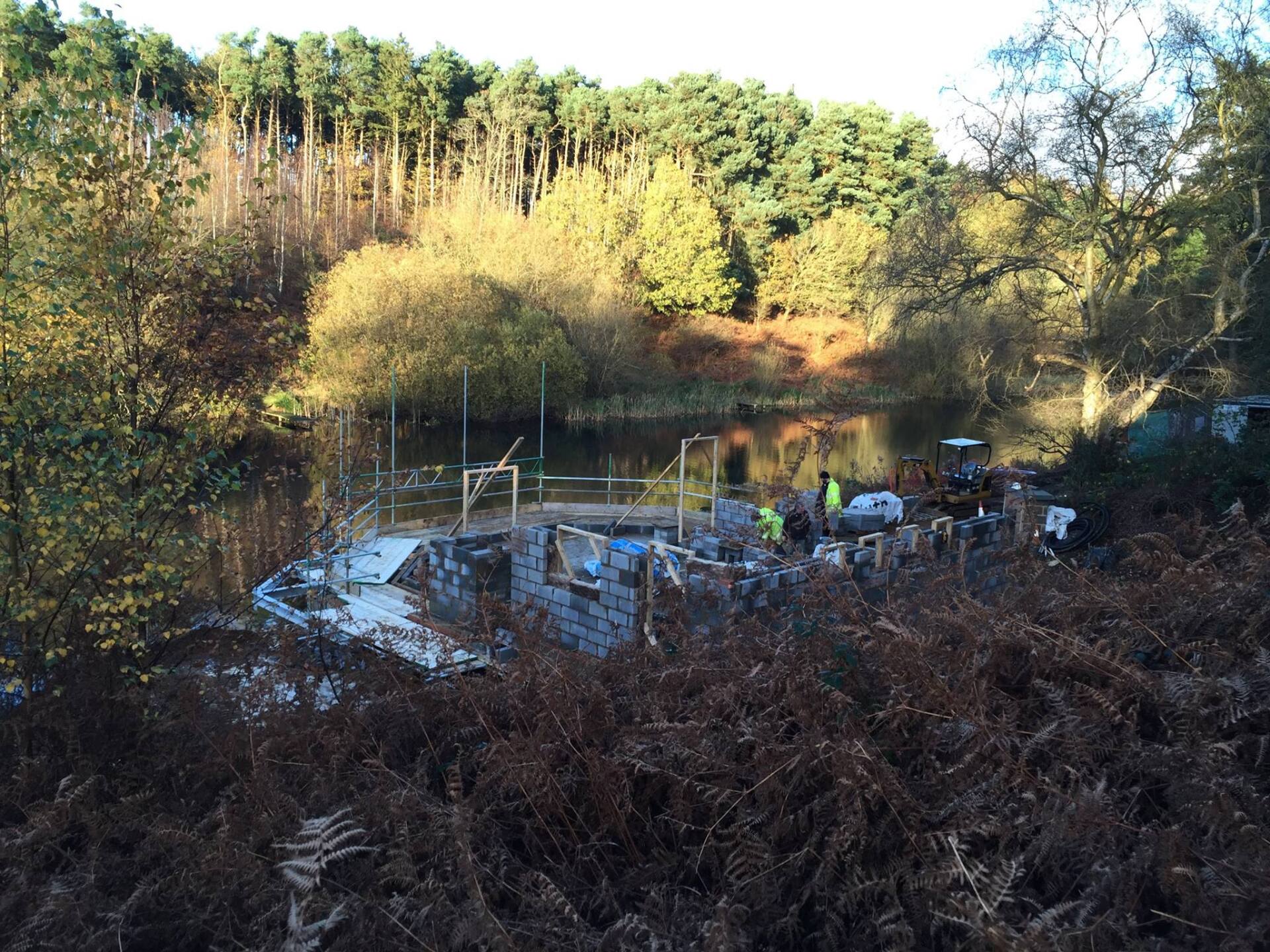 There were many challenges to overcome throughout the construction of this project. The main one being the site location, as it is situated 400 metres from the public highway, and 200 metres from the small carpark area that serves the lake. The grass track that runs alongside the lake to the site location was very fragile and could not withstand heavy plant, so all building products had to travel to the site location in small quantities.